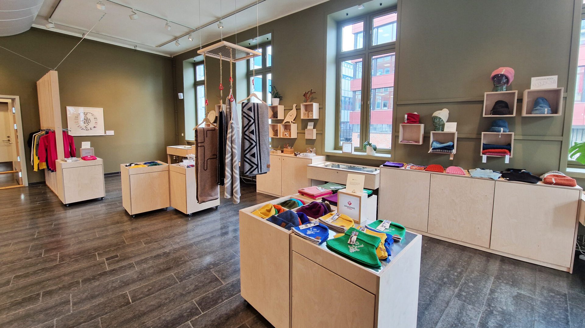 Våre museumsbutikker fokuserer på håndlagde produkter fra kunsthåndverkere i hele Nord-Norge og Sápmi. Det er viktig for oss å kunne tilby bærekraftige produkter laget av naturlige eller resirkulerte materialer, så hos oss finner du produkter fra nordnorske designere som henter sin inspirasjon fra naturen, og som lager produkter blant annet av tre, lakseskinn, resirkulert glass, resirkulert glass, lys av naturlig kokosnøttvoks.