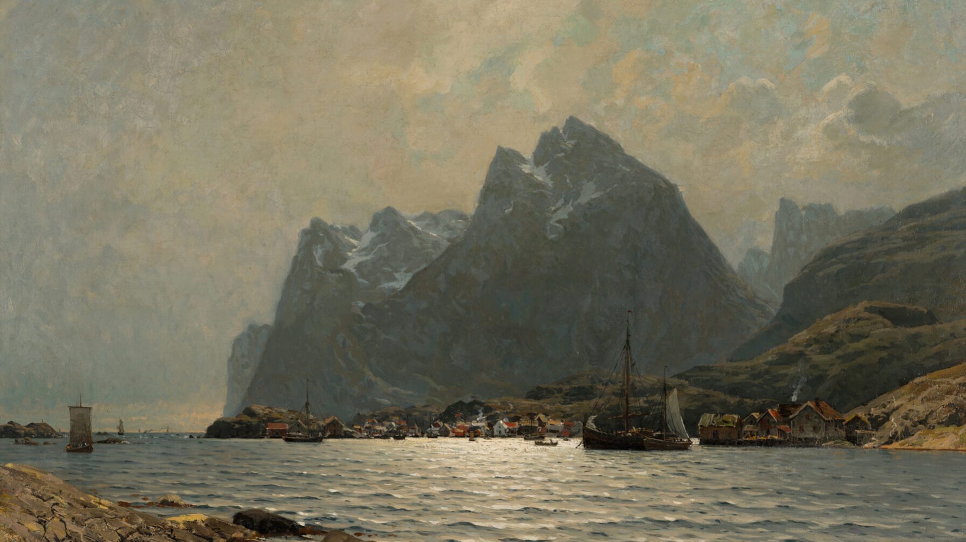 Eilert Adelsteen Normann (1848–1918) was born on Vågøya in Bodin (today part of Bodø municipality). After initial studies in Copenhagen, he pursued an artistic career, moving to Düsseldorf in 1870 to study at the Academy of Art. Normann became known for his coastal landscapes of Northern and Western Norway, though he also painted urban scenes. By 1887, he had settled in Berlin and gained international recognition. As one of the first professional painters from Northern Norway, Normann played a key role in bringing his home region’s landscapes to a European audience.