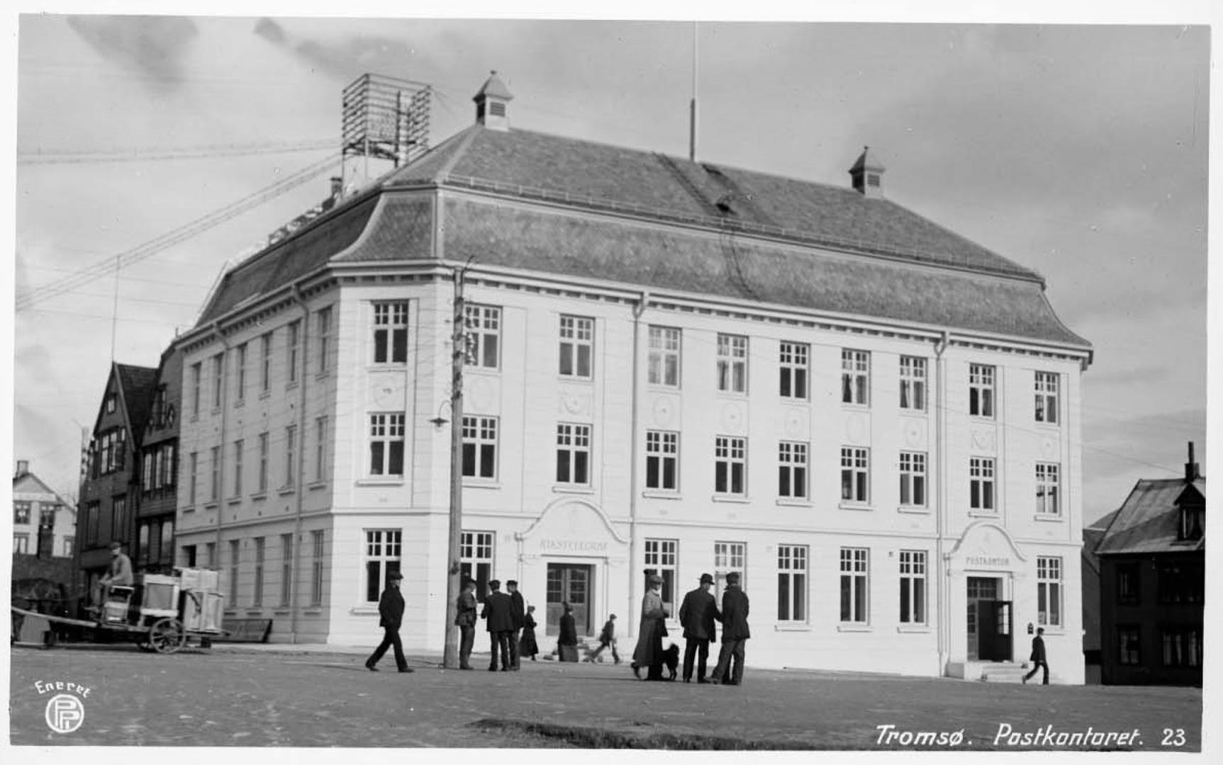 Sjøgata 1 was originally built around 1840. In the 1800s it was first used as housing, then as a home for sailors. In 1914, work began on the construction of the Post and Telegraph building which was completed and fully furnished two years later. The Telegraph Office and Post Office were stationed there until 1956 and 1968 respecticely, when they moved for need of more space. From 1971 to 1996, the building was the location of the Troms Police Station and since 2002, the building has been the home of Nordnorsk Kunstmuseum. The monumental brick building at Sjøgata 1 was designed by architect Søren Andreas Wiese Opsahl in 1917 (source: Localhistoriewiki).