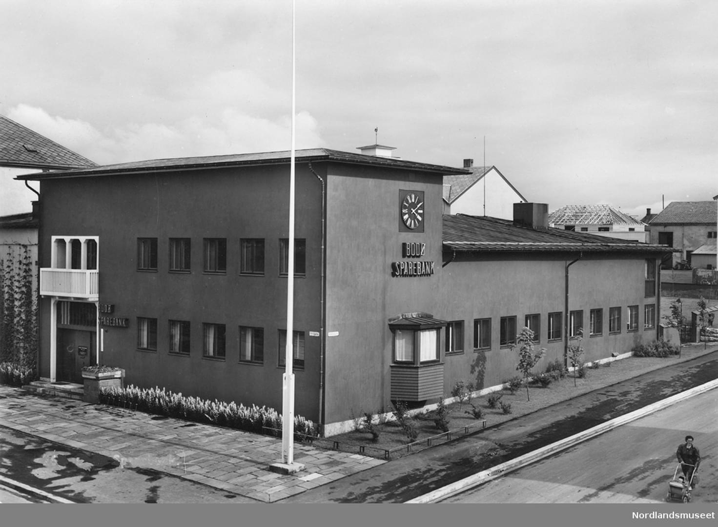 Bodø Sparebank was established in 1857 and later became Sparebank 1 Nord-Norge. The former building burned down during the bombing of Bodø in 1940. The new bank building, designed by architects Arne Pedersen and Reidar Lund, was inaugurated in 1950. A small extension to the south, designed by architect Per Andreas Hofstad, was added in 1969, and in 1982 the building was extended again towards Dronningens gate.