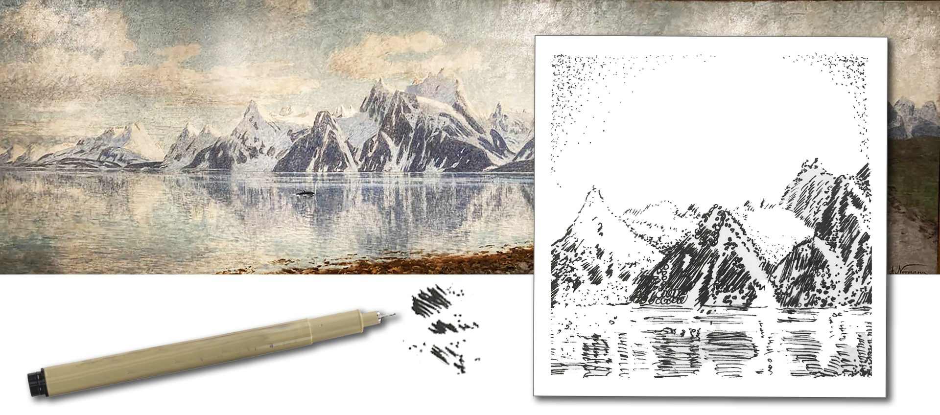 Hvordan kan ditt personlige uttrykk av Lyngsalpene bli når du leker deg fram med sort tusj og lager små punkt, linjer og flater for å få fram motivet?