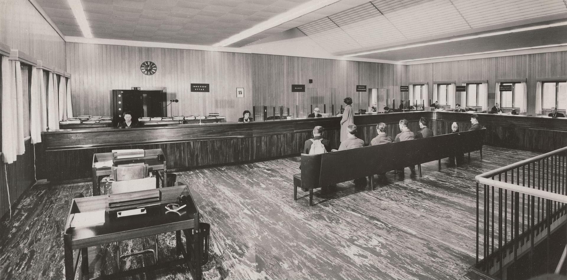 Bildetekst: Bygget ble oppført i 1950 i funksjonalistisk gjenreisingsarkitektur. Bygningen ligger i et område med nasjonal kulturmiljøverdi.
